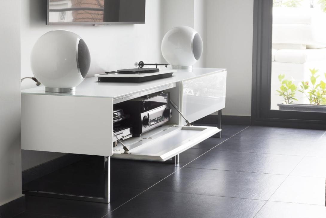 Meuble AV laqué, compatible IR et modulable.
