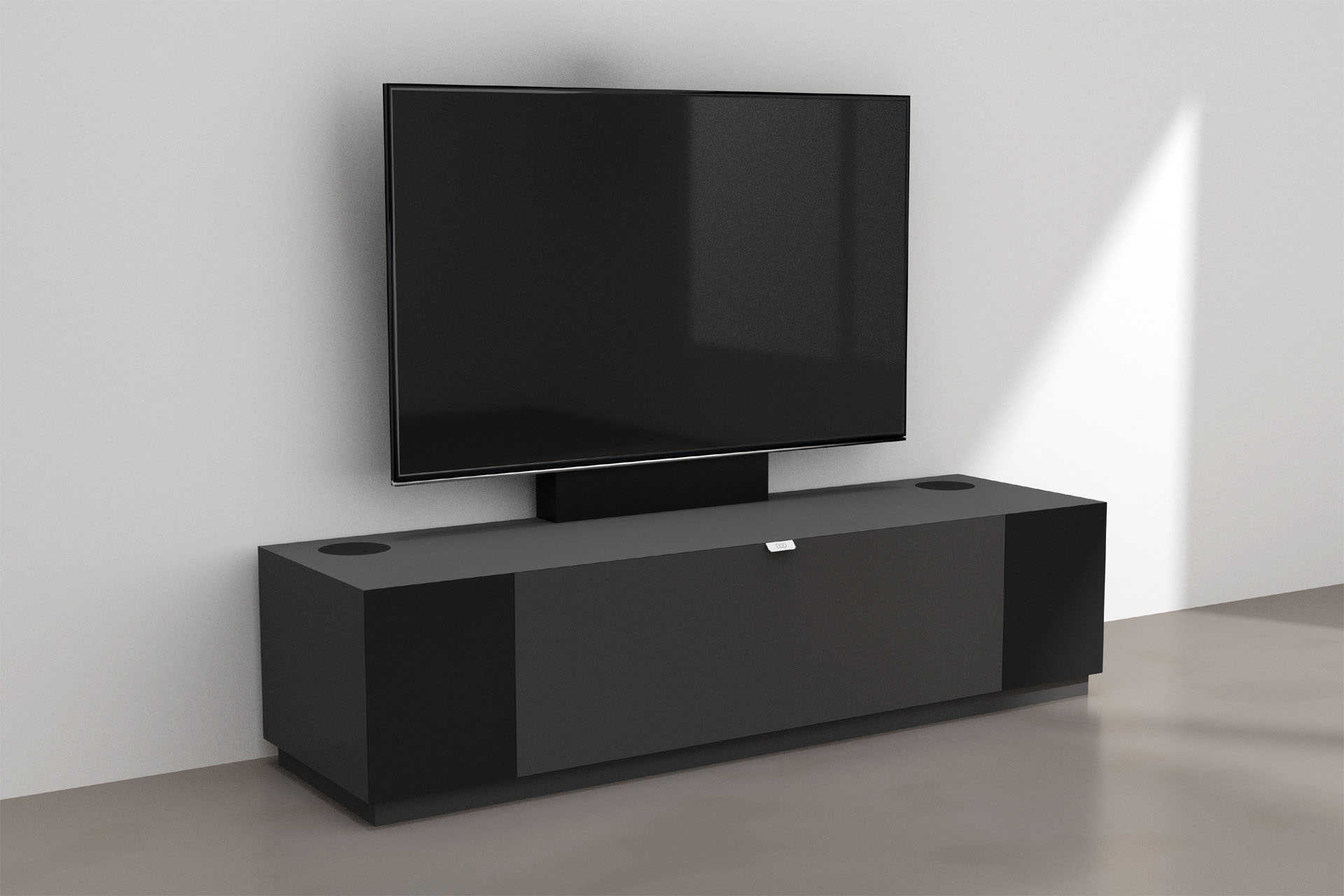 SWISS HD ermöglicht mit seinen AV-Möbel Lösungen ein berauschendes Musik-Erlebnis mit nahtlos integrierten Lautsprechern. Das Stage 3 Lautsprecher-System hat für eine bessere räumliche Abbildung 2 zusätzliche Ambient-Lautsprecher auf der Oberseite des Möbels.