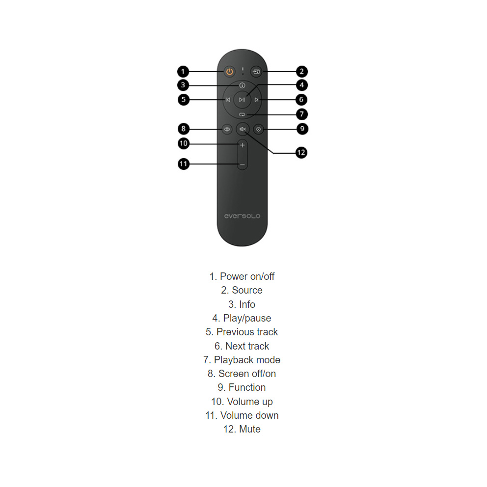 La télécommande BTR12 d'Eversolo fonctionne avec deux piles AAA (non comprises dans la livraison). Vous pouvez utiliser la télécommande pour effectuer les opérations suivantes : marche/arrêt, sélection de la source, informations, lecture/pause, piste précédente, piste suivante, mode de lecture, marche/arrêt de l'écran, fonction, volume +, volume -, désactivation du son.