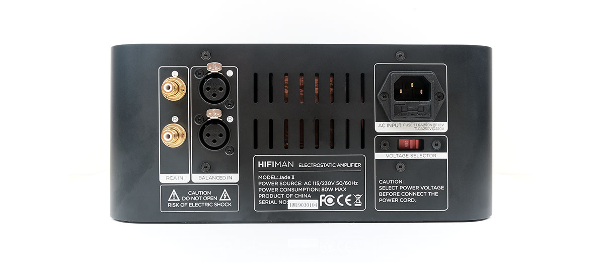 L'amplificateur électrostatique correspondant, en aluminium noir léger, utilise deux amplificateurs à double opération et un circuit imprimé soigneusement conçu qui réduit les interférences au minimum afin d'obtenir un son précis et transparent. Sur la face avant se trouvent un interrupteur marche/arrêt, un bouton de volume massif à 21 positions et deux sorties casque électrostatiques à 5 pôles pour brancher le casque JadeII. Une entrée audio RCA et une entrée XLR symétrique à 3 pôles sont disponibles à l'arrière de l'amplificateur.