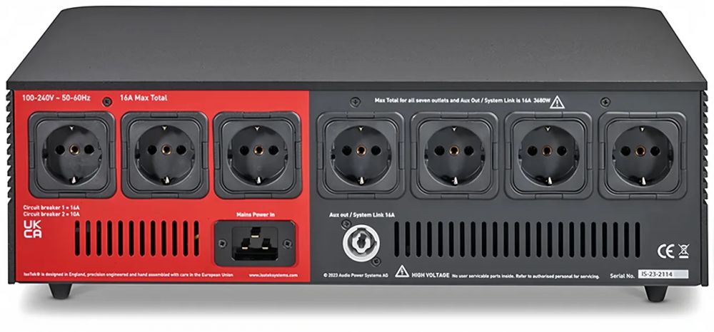 Il y a trois prises à courant élevé et à faible impédance, d'une capacité de 16A, délivrant 3 680W à 230V ou 1 840W à 115V. Elles conviennent à tous les types d'amplificateurs de puissance, de haut-parleurs actifs et de caissons de basse, ainsi qu'aux téléviseurs actuels, et présentent une version allégée du circuit Direct Coupled© du Titan. Les quatre autres sorties à courant moyen de 10A sont conçues pour les composants de source. Elles sont dotées de la technologie unique Adaptive Gating © d'IsoTek qui détecte automatiquement la charge connectée, fournissant ainsi la puissance propre optimale en fonction de la consommation d'énergie. Le réseau de nettoyage est plus sophistiqué que celui de l'Aquarius.
