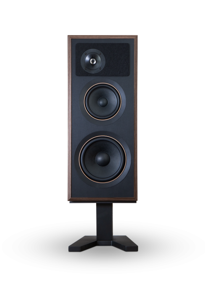 Enceinte de style rétro en placage de noyer à grain ouvert et pieds d'enceinte dédiés.