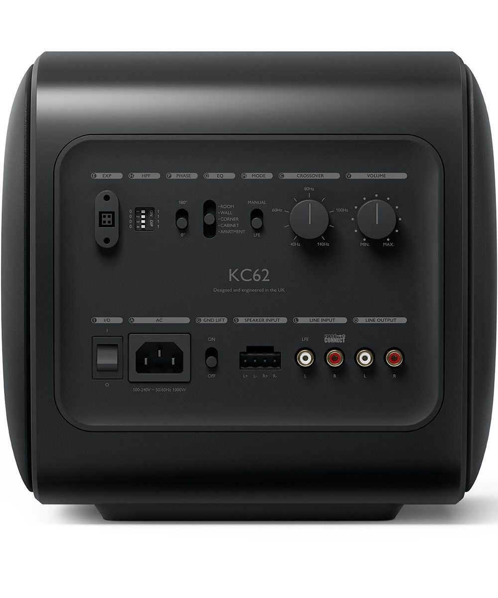 Die Anschlussmöglichkeiten des KC62 erlauben die Verwendung mit fast jedem Audiosystem, wobei KEF SmartConnect und die Lautsprecherpegel-Eingänge jegliche Anschlussprobleme beseitigen. Der Line-Ausgang mit HPF ermöglicht eine außergewöhnliche, fein abgestimmte Anpassung. Der KC62 ist auch mit dem KW1 kompatibel, was eine einfache kabellose Verbindung ermöglicht.