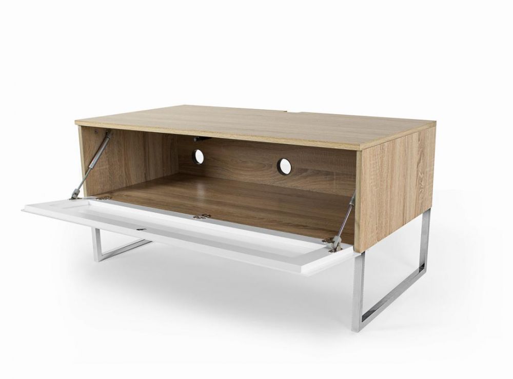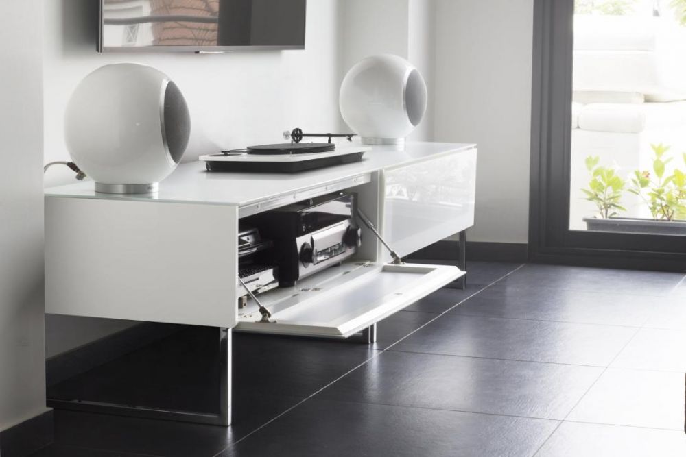 Sobre et raffiné, ce meuble dispose d’un compartiment bénéficiant d’une porte avec abattant capable de laisser passer les signaux infrarouges. Grâce à ses pieds amovibles, le Kahlm pourra être fixé contre un mur à la hauteur voulue. Egalement pratique, la partie arrière du Khalm a été pensée pour permettre un passage de câbles aussi bien par le fond que par le dessous du meuble.
