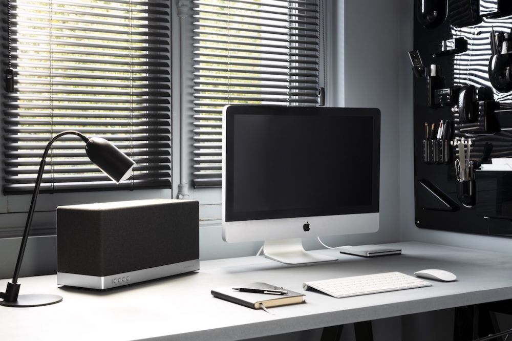 Mit einer Bespannung aus dem wunderschönem Stoff der skandinavischen Marke Gabriel in Schwarz, Grau, Blau und Grün und Teilen aus gebürstetem Aluminium verschmilzt die AIO 3 elegant mit Ihrem Wohnzimmer, Schlafzimmer oder sogar der Küche.