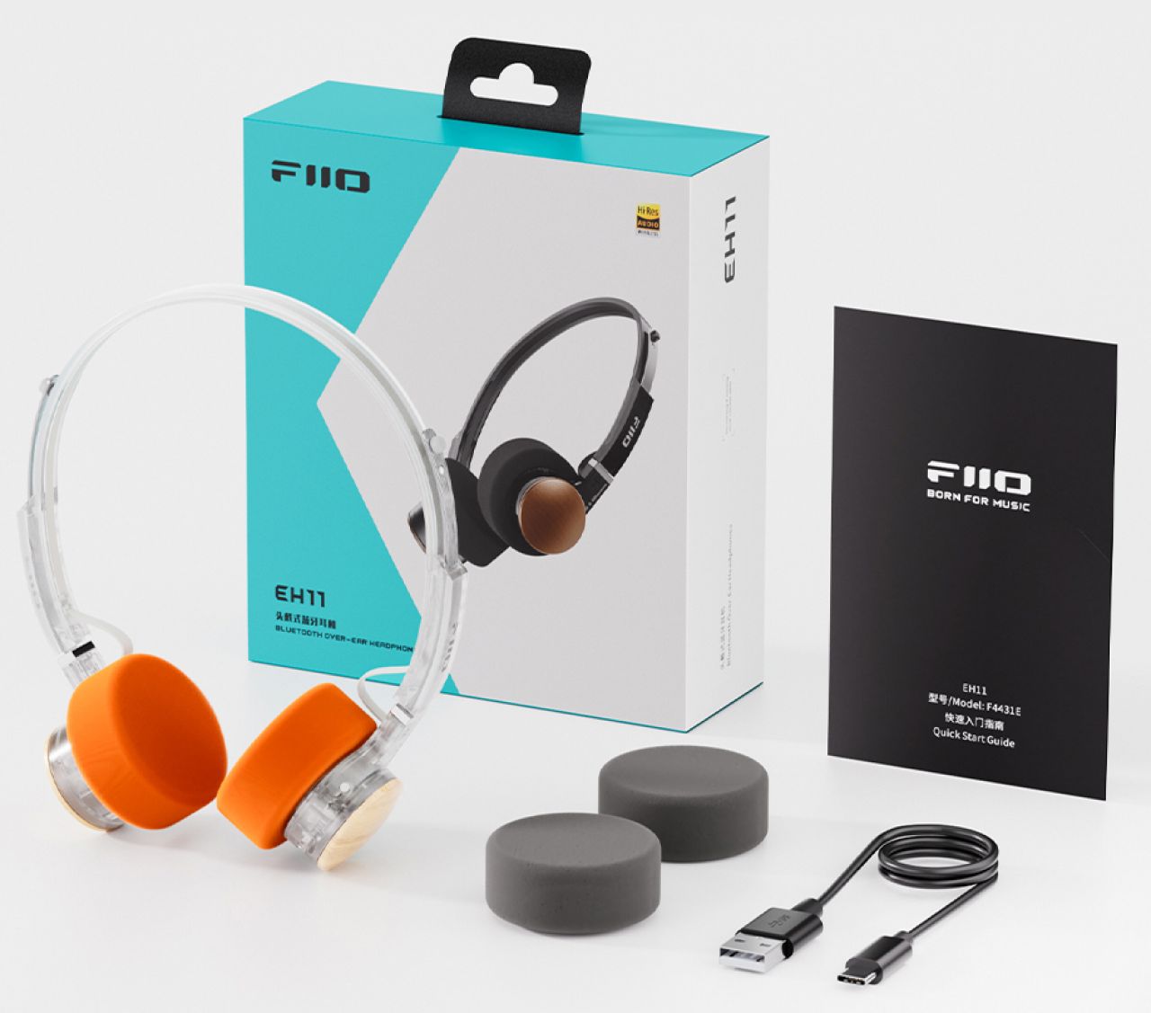 Contenu de la livraison : Casque FiiO EH11, câble de recharge USB-C vers USB-A, 1 paire de coussinets orange, 1 paire de coussinets gris