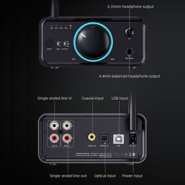 Il est utilisé comme lien entre un ordinateur, un lecteur de musique, un smartphone, etc. comme source d'entrée et des haut-parleurs actifs ou un casque comme source de sortie, et vous profitez ainsi d'un système audio de haute qualité et peu encombrant. La technologie d'amplification THX AAA 788+ atteint une puissance considérable de jusqu'à 2000 mW et peut ainsi alimenter n'importe quel écouteur ou casque et générer un son musical captivant. Les deux convertisseurs numériques-analogiques AK4493S du fabricant japonais AKM traitent des signaux audio haute résolution jusqu'à 32 bits et 384 kHz ainsi que DSD. Le timbre agréablement chaud de ces DAC, avec leur résolution fine et détaillée, vous fera redécouvrir et aimer votre musique. Les nombreuses possibilités de connexion font du FiiO K7 BT une interface pour votre équipement audio. Ordinateur, lecteur de musique, smartphone, tablette, etc. peuvent être connectés à l'entrée USB, aux entrées RCA ainsi qu'aux entrées coaxiales ou optiques. Pour la réception sans fil, le K7 BT est équipé de Bluetooth et prend en charge tous les formats courants comme aptX, AAC, LDAC et SBC. Des sorties RCA sont disponibles pour le raccordement de haut-parleurs. Un casque se branche à l'avant du K7 BT sur la prise 6,3 mm ou sur la prise symétrique 4,4 mm. Sur la face avant du FiiO K7 BT se trouve un régulateur pour deux réglages de gain, de sorte que les casques avec différentes sensibilités fonctionnent de manière optimale. Un autre commutateur permet de passer d'une source d'entrée à l'autre (USB / optique / coaxiale / ligne / Bluetooth). La grande molette en métal à l'avant du K7 BT permet un réglage précis du volume. Avec son boîtier solide en aluminium d'un noir discret et ses dimensions compactes, le FiiO K7 BT s'intègre aussi bien sur un bureau que dans un rack hi-fi.
