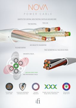 Le câble d'alimentation Nova se compose de cinq conducteurs en cuivre OFHC massif coulé en continu, disposés dans une configuration géométriquement équilibrée - très inhabituelle dans ce segment de prix. Deux paires de conducteurs sous tension et neutres sont disposées de part et d'autre du conducteur de terre, qui se trouve au centre du câble. Le conducteur de terre est disposé dans une configuration de fusil de chasse et n'est pas torsadé comme sur d'autres câbles d'alimentation. Les conducteurs sous tension et les conducteurs neutres sont disposés dans une configuration entièrement symétrique, de sorte que leurs champs magnétiques s'annulent mutuellement. En conséquence, il n'y a pas de champ magnétique résiduel agissant sur le conducteur de terre central, ni de tension induite indésirable sur le conducteur de terre - iFi Audio appelle cette construction Ground Zero. Le résultat ? Une alimentation électrique absolument propre et silencieuse. Grâce à la combinaison de matériaux de haute qualité et d'une construction de premier ordre, le câble d'alimentation Nova fournit une impédance constante et une suppression supérieure des EMI/RFI, préservant ainsi la pureté du courant de secteur qui alimente les composants de votre système audio ou AV. Le câble d'alimentation Nova se combine parfaitement avec le bloc multiprise PowerStation d'iFi Audio. La PowerStation filtre les perturbations de mode commun et différentielles du réseau électrique, tandis que Nova garantit une pureté optimale jusqu'aux composants connectés.
