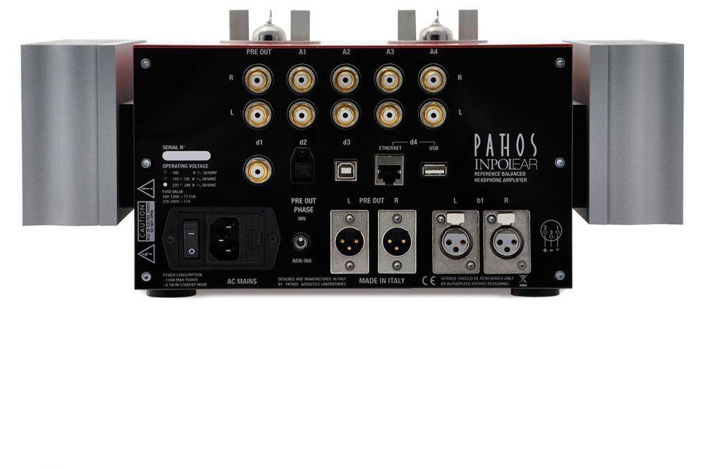 La partie inférieure de la façade du Pathos Inpol Ear reçoit les boutons de mise sous tension et de sélection de la source, ainsi qu'un afficheur LCD. Des caractères rouges indiquent la source sélectionnée et le niveau du volume sonore. S'y trouvent également les sorties casques (jack 6,35 mm et XLR x2) ainsi qu'un port USB (type A) utilisable uniquement si l'ampli est équipé de la carte optionnelle Pathos HiDac Evo avec DAC intégré. Cette dernière permet également de profiter du port USB de type B, du port USB de type A, des deux entrées S/PDIF (une optique et une coaxiale) et de la prise réseau RJ45 sur la face arrière de l'appareil. En plus de l'entrée Ligne XLR et des quatre entrées RCA, la connectique analogique comprend deux sorties pré-amplifiées (RCA et XLR), le Pathos Inpol Ear pouvant ainsi assumer le rôle de pré-ampli stéréo en étant associé à un ampli de puissance et des enceintes.