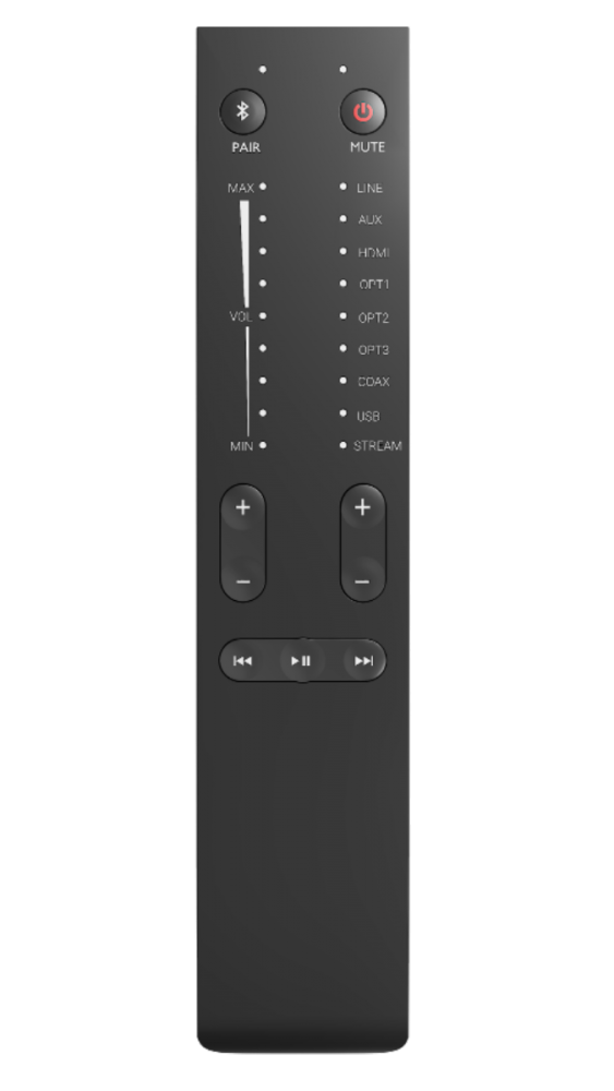 Le PIEGA connect+ est livré avec une télécommande sans fil permettant de régler le volume, de sélectionner des sources, et plus encore. La technologie radio bidirectionnelle permet à la télécommande d'indiquer la sélection actuelle de la source et du volume.