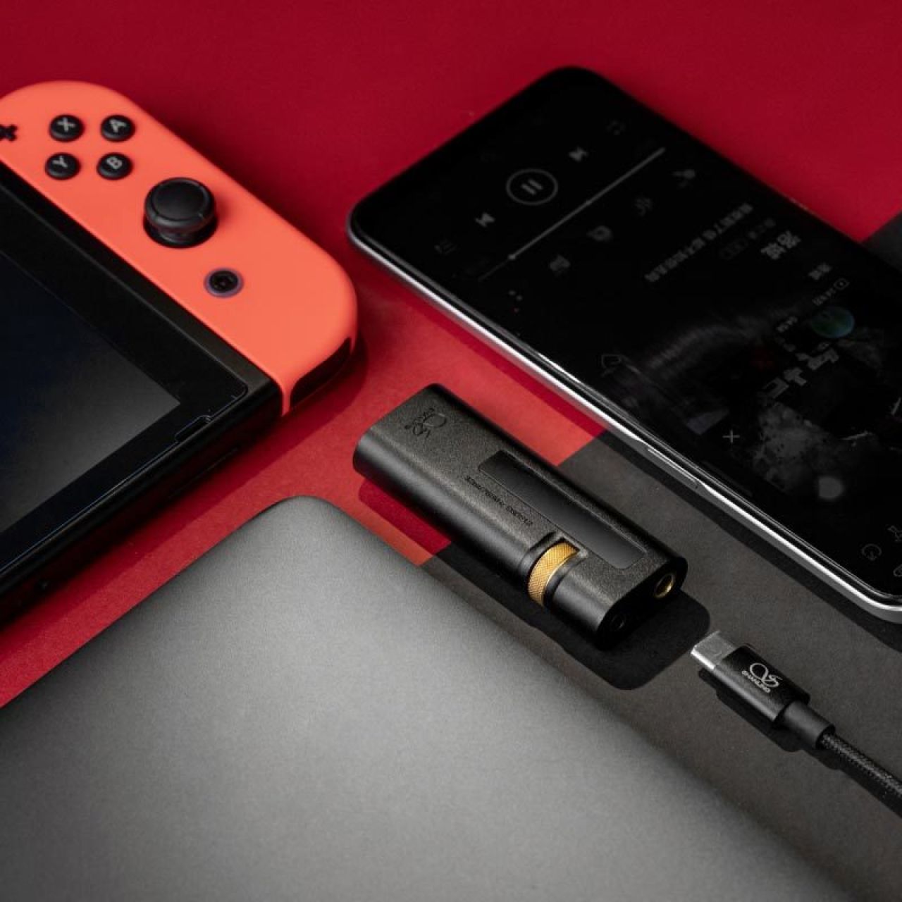 La molette de volume sert également à naviguer dans le menu, ce qui est très facile grâce à l'écran intégré de 1,44 pouces. Deux puces ESS ES9038Q2M DAC garantissent un décodage efficace du signal audio et une reproduction sonore extrêmement précise. Cette architecture permet également de lire des fichiers audio haute résolution en PCM jusqu'à 32 bits et 768 kHz ou en DSD jusqu'à DSD512. Deux puces Ricore RE6863 ont été utilisées pour l'amplification des opérations, ce qui garantit un bruit minimal et une distorsion très faible. Le port USB-C permet de connecter le Shanling UA5 à un smartphone, une tablette ou un ordinateur portable. Pour que l'UA5 puisse également être utilisé sur un PC ou une console de jeu, un adaptateur USB-C vers USB-A est fourni. Si vous souhaitez utiliser le UA5 avec un iPhone ou un iPad, vous aurez besoin d'un câble USB-C vers Lightning. Pour le raccordement d'un casque, le Shanling UA5 dispose d'une prise asymétrique de 3,5 mm et d'une prise symétrique de 4,4 mm. Le UA5 offre deux modes de fonctionnement : en mode d'alimentation Full USB, il peut tirer toute l'énergie du smartphone, de la tablette ou de l'ordinateur connecté. En revanche, en mode d'alimentation hybride par batterie, les DAC et les amplificateurs opérationnels de l'UA5 sont alimentés par la batterie interne de 220 mAh. La batterie du smartphone est ainsi moins sollicitée et une alimentation propre et régulière est garantie. Le Shanling UA5 présente une finition soignée, est extrêmement compact et constitue une solution minimaliste et pratique pour améliorer la qualité du son de manière nettement audible.