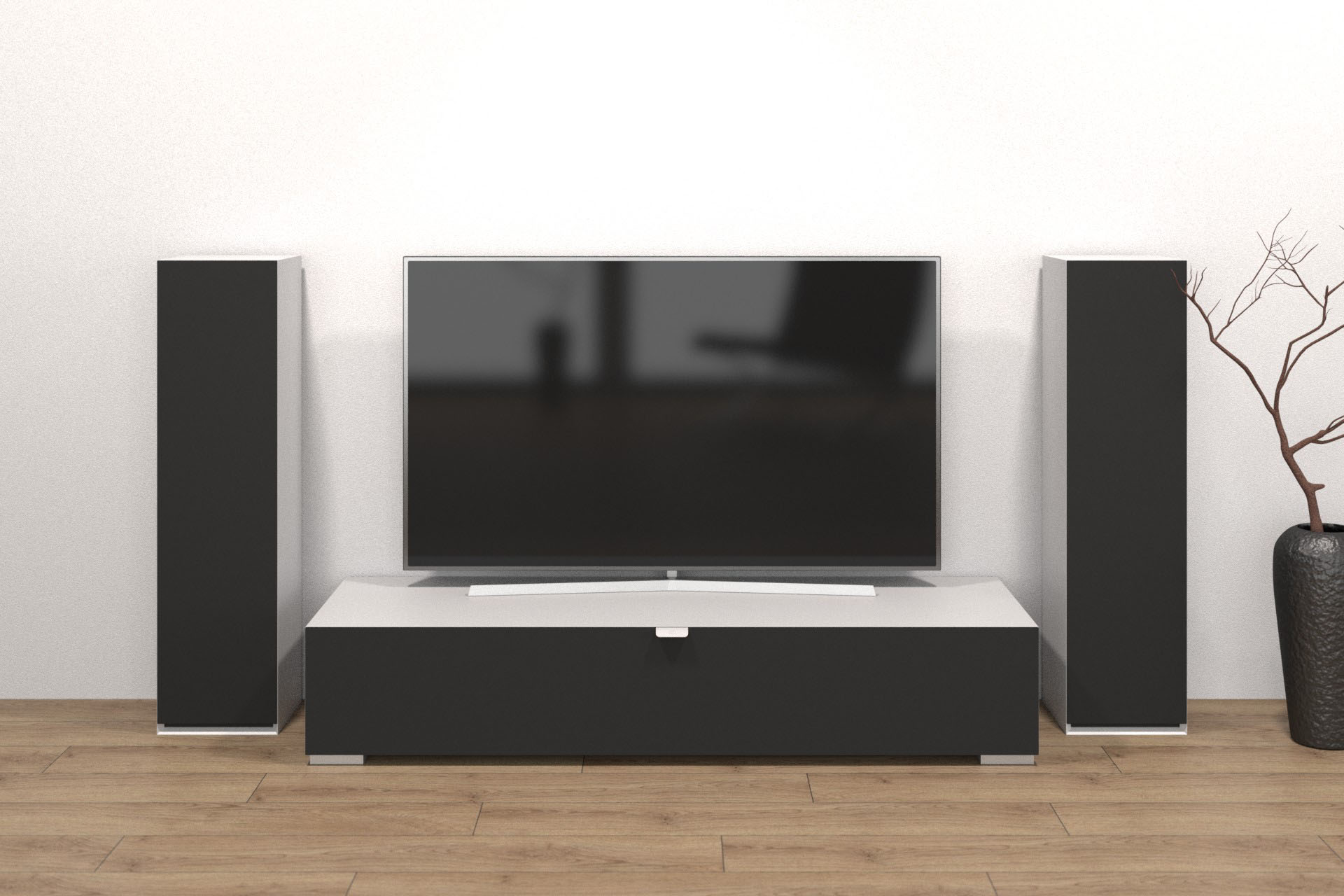 SWISS HD garantit le meilleur divertissement, même là où il n'y a pas beaucoup d'espace. Le AV-Board est la solution idéale en tant que système audio/vidéo compact et personnalisable en hauteur (de 90cm) et en largeur (de 83cm) pour les téléviseurs de 43" à 85". Le système d'enceintes intégré Stage 2 est basé sur l'Ensemble 2 avec un rayonnement ambiant supplémentaire pour une meilleure imagerie spatiale. Le AV-Board a de la place pour un petit amplificateur.